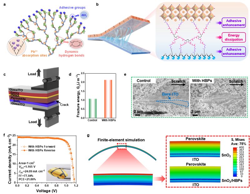 超支化聚合物(HBPs)粘合剂层与SnO2电子传输层和钙钛矿层的粘结效应。(a)HBPs的分子结构;(b)HBPs粘结SnO2和钙钛矿界面的示意图;(c)器件的双悬臂梁(DCB)试验示意图;(d)标件和HBPs修饰器件的界面断裂能;(e)纳米划痕测试后钙钛矿薄膜的SEM图;(f)1 cm2的最优柔性器件的J-V曲线;(g)器件的有限元仿真模拟。