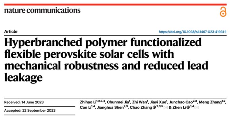 基于此工作,李祯教授与航空学院张超教授合作,在Nature Communications上发表题为“Hyperbranched polymer functionalized flexible perovskite solar cells with mechanical robustness and reduced lead leakage”的论文。第一作者为beat365航空学院博士研究生李志浩。