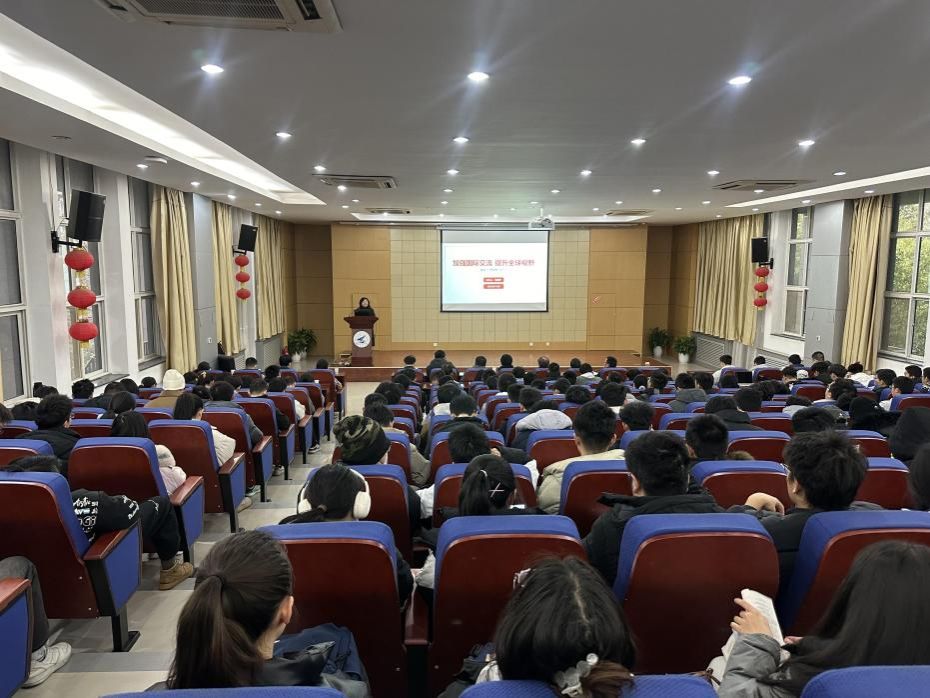 张艳宁从回顾历史、把握大局、摆正角色三个角度入手,结合学习习近平新时代中国特色社会主义思想、党的二十大精神、习近平总书记在中共中央政治局第五次集体学习上的重要讲话精神,从新时代教育国际合作交流概况、高等教育对外开放相关政策、学校国际交流合作主要成效、青年大学生全球视野提升学校国际交流政策等方面阐释了强学习、宽视野、增才干的主题思想。
