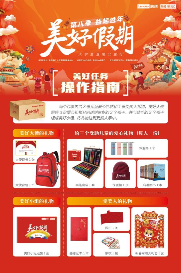 “梦想是星辰大海,我们的使命是责任与担当。”会上,联想集团联想中国市场推广高级经理李晔发布了“美好假期”第八季任务:志愿者和乡村儿童一起用绘画套装进行快乐共创,并陪伴他们阅读世界名著,拓展小朋友的知识面,让孩子们激发积极向上的斗志和梦想,也让受帮扶家庭新年不孤单,人人都拾起自信,绽放笑脸。