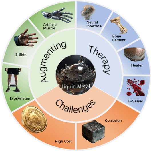 图1. 液态金属在生物医学方面的应用与挑战