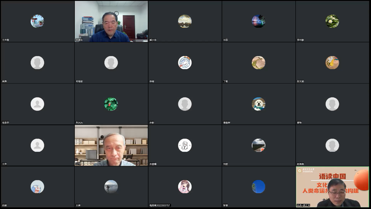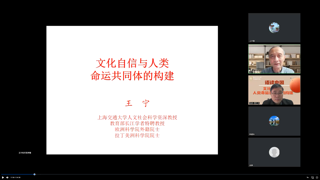 西工大新闻网10月28日电(王开薇)10月28日,外国语学院举办了“语读中国”的第二场线上讲座。上海交通大学人文学院院长、人文学科资深教授、拉丁美洲科学院院士、欧洲科学院外籍院士王宁教授应邀主讲,学校党委副书记陈建有、院领导班子成员及英语、德语专业100余名师生参加。本次讲座由学院院长孔杰主持。