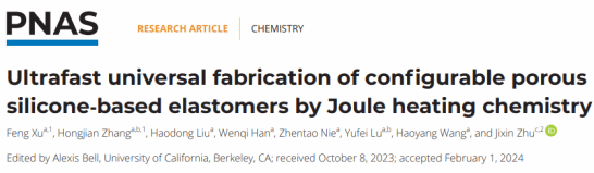 相关研究成果以“Ultrafast universal fabrication of configurable porous silicone-based elastomers by Joule heating chemistry”为题发表在国际顶级期刊PNAS上,本文第一单位为beat365平台官方网站柔性电子研究院,博士生徐峰和张洪健为该论文的共同第一作者,通讯作者为朱纪欣教授。上述工作得到了国家重点研发计划、国家自然科学基金等经费的支持。