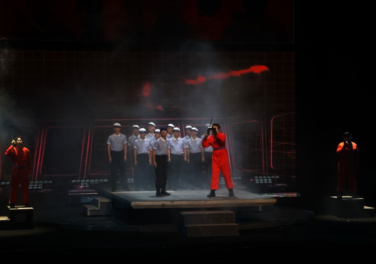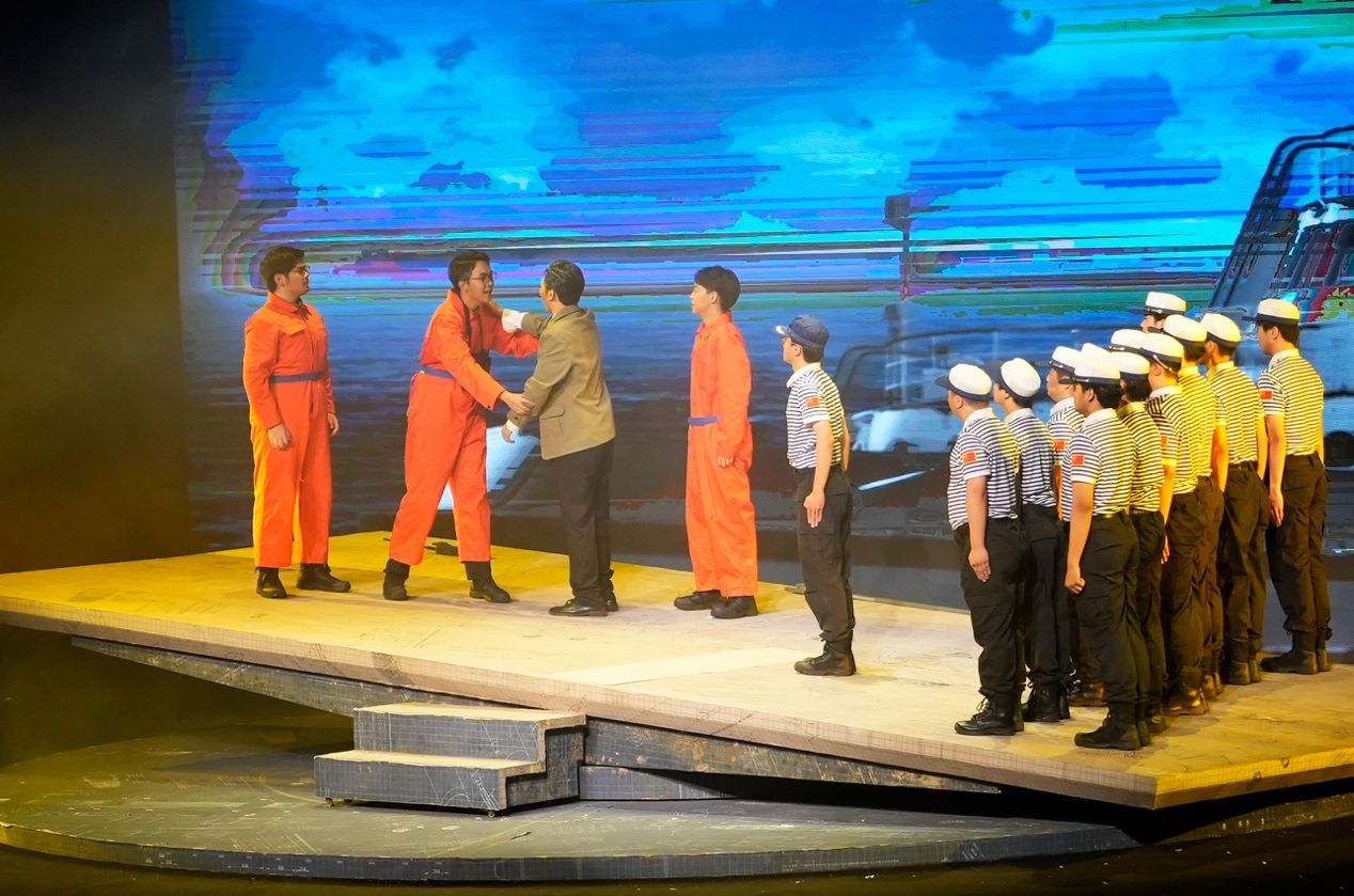 作品以学校“全国高校黄大年式教师团队”、自主水下航行器团队的真实故事为素材,成功塑造了周文渊、冯至远、马达、章若楠等科研工作者群像,通过呈现项目立项过程中备受质疑、研发过程万分波折、危机时刻大义舍身的一幕幕场景,深刻阐释他们潜心科研、矢志报国的家国情怀。演出现场,随着科研团队集体走上军舰甲板,在动人配乐的渲染下,观众们心情激荡,被成功带入剧情之中,与这群科研工作者们一同走向广阔的蔚蓝深海,翱翔学生中心响起阵阵掌声。