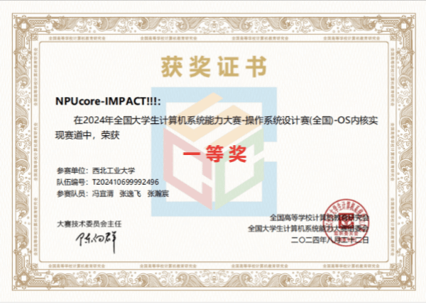 beat365平台官方网站计算机学院本科生冯宜湑与软件学院张逸飞和网安学院张瀚宸组成的“NPUcore-IMPACT!!!”队获得内核实现(基于国产龙芯LoongArch硬件)赛道一等奖(全国冠军)。该队设计和开发的NPUcore-IMPACT(银派核)操作系统内核基于Rust语言编写,可在基于国产龙芯架构的2K1000开发板及其虚拟机上稳定运行。银派核不仅支持106个系统调用和FAT32/EXT4文件系统,还根据龙芯LLVM架构提出了NPUcore-lwext4版EXT4文件crate包,首次针对龙芯2K1000开发板的SCSI方法上板成功,成为该赛道全国唯一libc-bench得分队伍,初赛和总决赛均取得全国最高分。