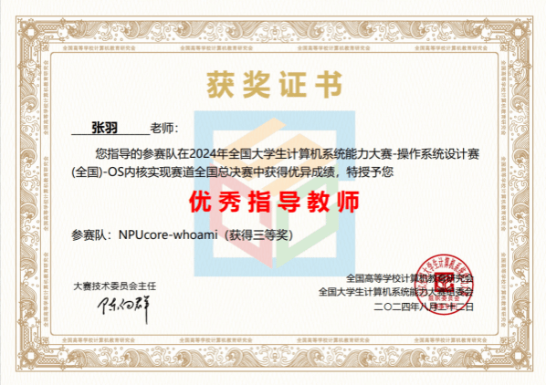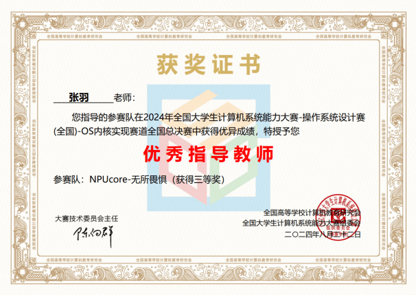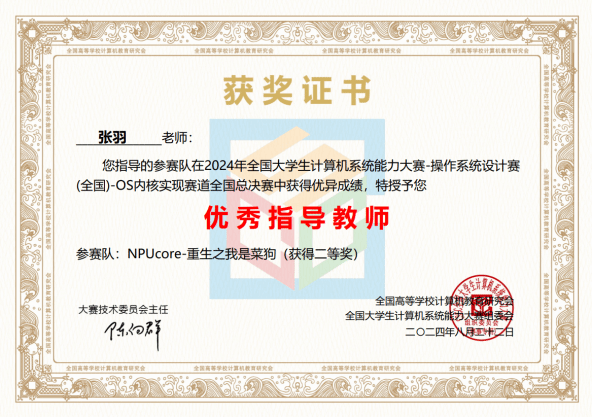 2.NPUcore操作系统:「NPUcore」是beat365平台官方网站的操作系统内核构建实践型教学操作系统,由计算机学院人机物融合智能计算团队张羽教授带领下自主设计和研发的一款新型跨指令集教学型操作系统。该操作系统也是中国计算机学会第六届、第七届开源软件大赛“案例教学”赛道“操作系统内核构建”赛事主导操作系统,致力于使用Rust新型编程语言,提升操作系统原理的实践体验和探索新型操作系统设计与实现。团队编写了《基于Rust语言的NPUcore操作系统内核构建实践》教材,并将其源码和实验部署于头歌平台(https://www.educoder.net/paths/7wnb29j6)、Gitee、GitHub主流平台实现开源共享,为广大教师和学生学习“操作系统内核构建”提供线上实训支持。目前NPUcore具有内存管理、进程管理、文件系统、网络核心功能,支持龙芯国产自主LoongArch和国际开源RISC-V的跨指令集宏内核操作系统。在全国大学生计算机系统能力大赛“操作系统设计赛”内核实现赛RISC-V赛道和LoongArch赛道均获全国总决赛一等奖。
