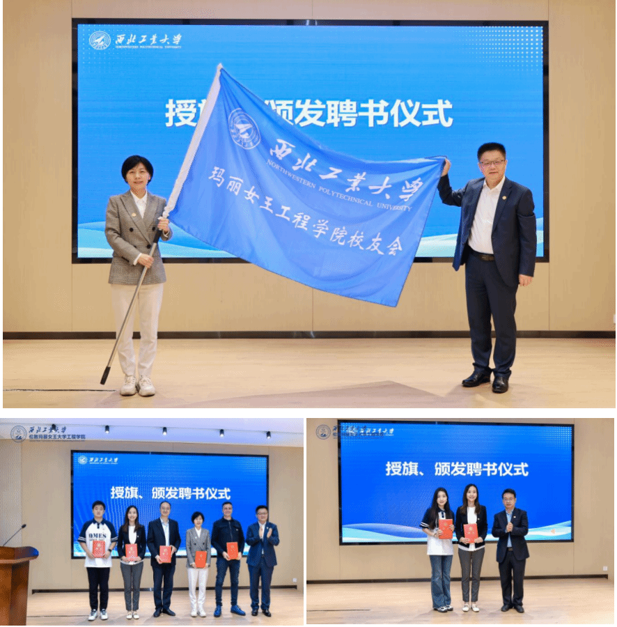 王宇波为玛丽女王工程学院校友会授旗,范晓丽接旗。王宇波、杨铭分别向玛丽女王工程学院校友会第一届理事会成员颁发聘书。