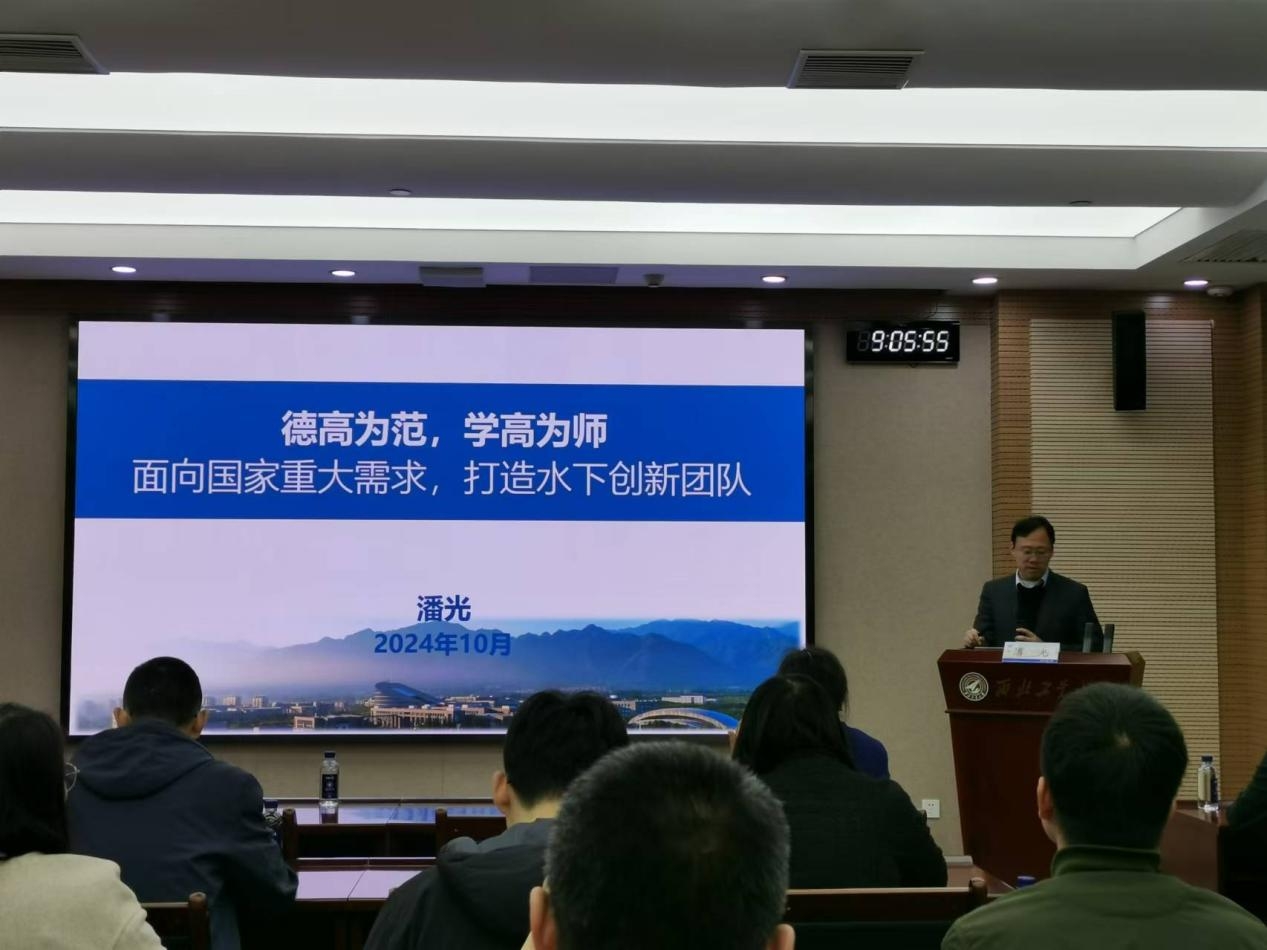 航海学院潘光教授结合自身工作经历,从团队发展、科学研究、教书育人三个方面分享了个人感悟和体会。他勉励青年教师要坚定“心有大我、至诚报国”的理想信念,面向国家重大战略需求,敢为人先、开拓创新,在解决受制于人的重大瓶颈问题上强化担当作为,同时积极开展“1→0”回溯性基础研究,从源头解决瓶颈问题,提升自主创新能力。要落实立德树人根本任务,脚踏实地干事,形成扎实而广博的专业素养,以严谨的求实态度和不拘一格的创新精神,引领和带动学生,着力培养担当民族复兴大任的时代新人。