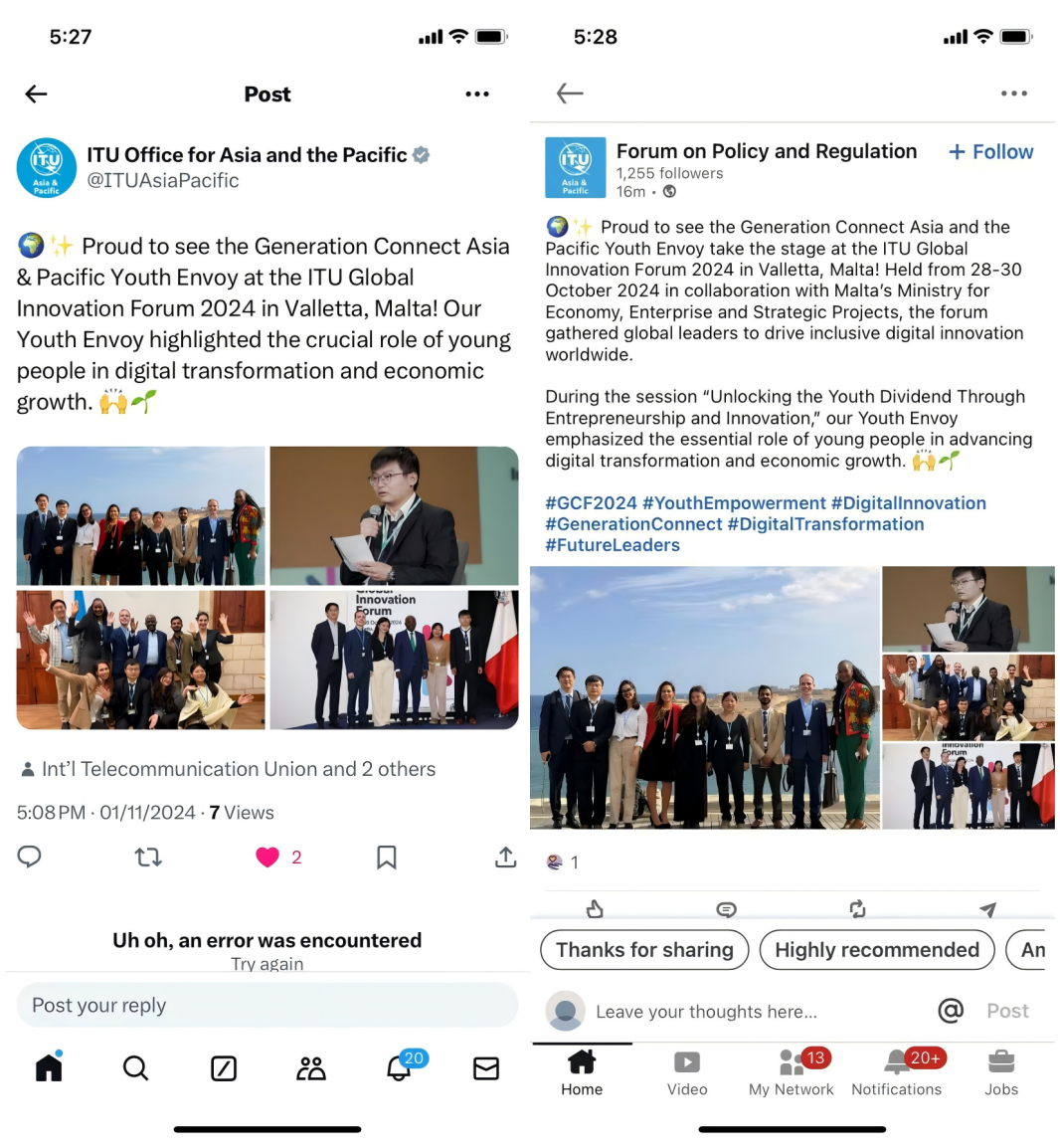 10月28日至10月30日,2024年国际电信联盟(以下简称“ITU”)全球创新论坛在马耳他举行,论坛由ITU与马耳他政府主办。beat365电子信息学院硕士研究生石卓勇受邀参会并作为亚太区唯一青年特使代表在论坛发言。学校国际合作处张宇一同参加本次活动。