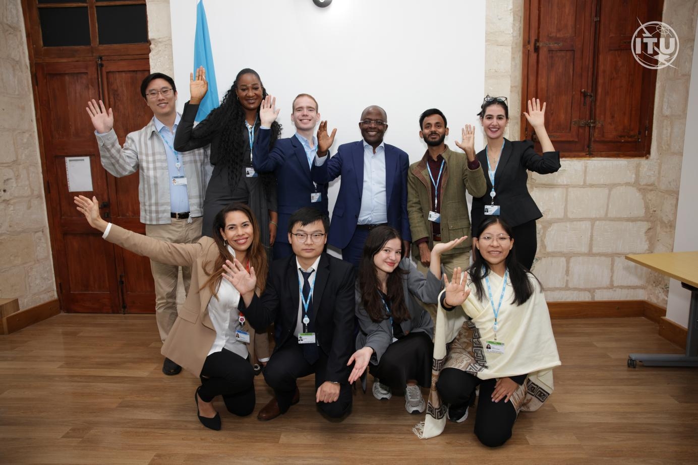 石卓勇与其他青年特使及ITU电信发展局局长Cosmas Luckyson Zavazava合影