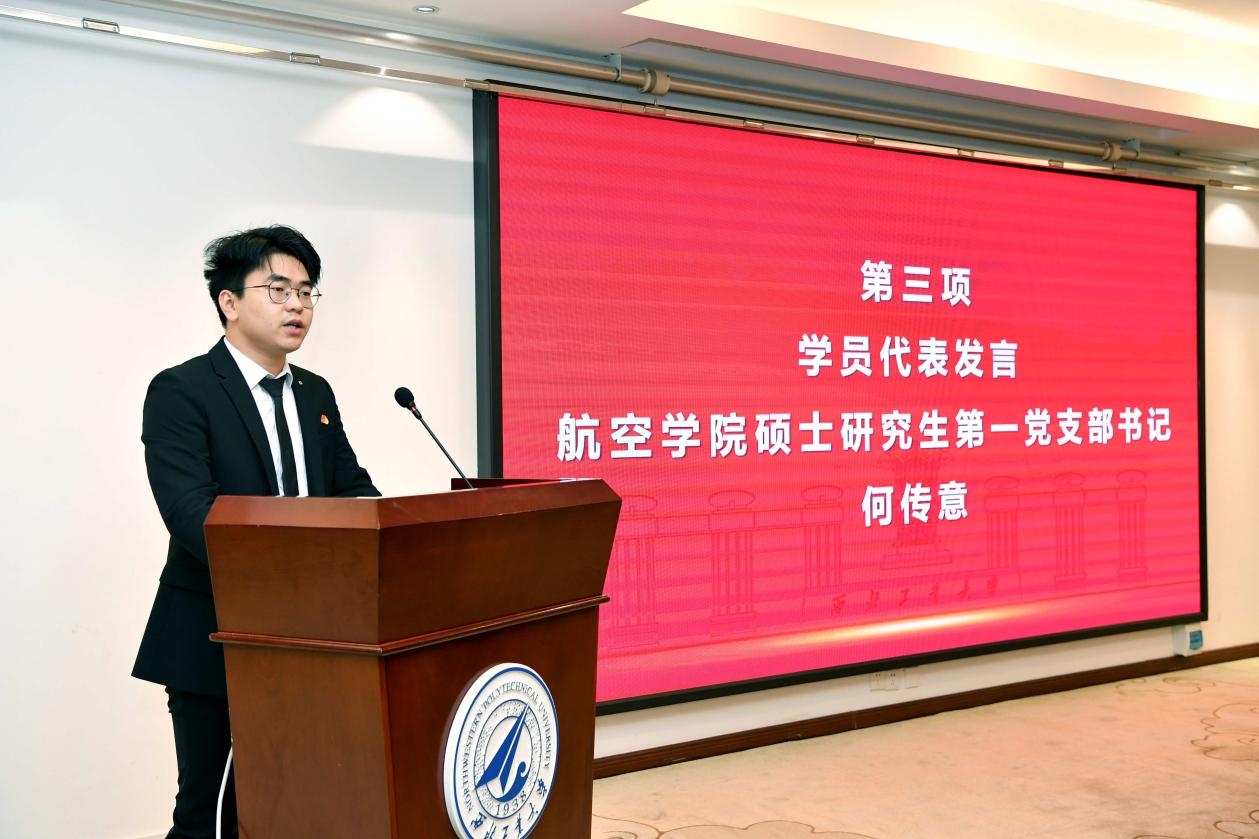 航空学院硕士研究生第一党支部的支部书记何传意作为学员代表发言。他结合自身认识、党员成长经历等,分享了学生党支部工作的认识及实际工作的感受,表达了对培训班学习的期待,并代表全体学员表态将严格遵守各项培训制度,努力做到学以致用、知行合一,以实际行动彰显学生党支部书记“领头雁”表率作用。