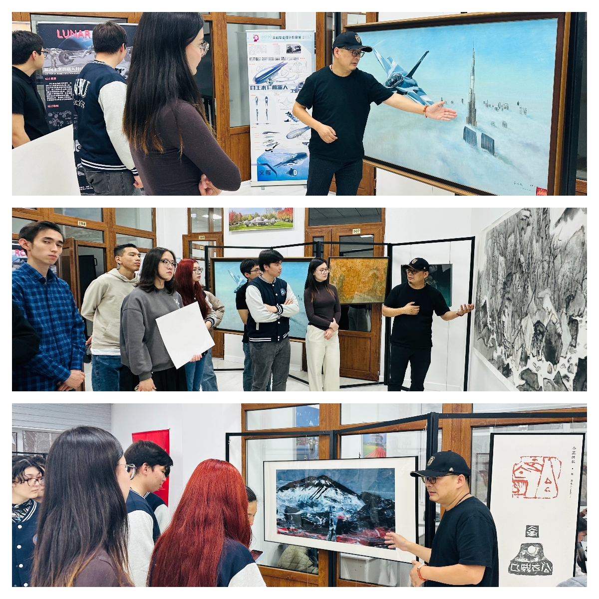 随后,与会人员共同参观展览。策展人金冈先生对展览进行了详细介绍,并配有中、英、哈、俄四种语言的翻译,方便师生深入理解作品的主题思想、创作灵感和表现手法。其中李海俊的《翱翔迪拜》深受学生喜爱。哈分校学生马格詹(Abish Magzhan)感叹道:“这幅画让人很震撼,看到它的那一瞬间我想象自己就是那架中国飞机,迪拜上空的云就是我脚下的路。”