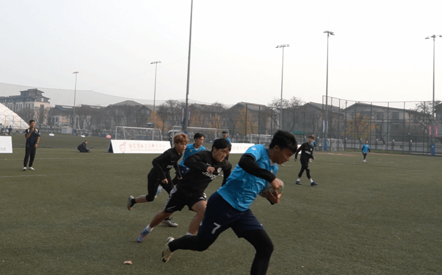 稍作休息后,迎来第一天的关键之战,自动化学院橄榄球代表队对阵中国农业大学的幺幺玖-兽刃联队。队员们稳扎稳打,在防守上寸步不让,步步紧逼,不断向对方进攻队员施压。比赛进行到一半时,李左与梁代福巧妙配合接球突破,顺利拿下一分。这场比赛最终以1:1战平,自动化学院橄榄球代表队顺利晋级半决赛。