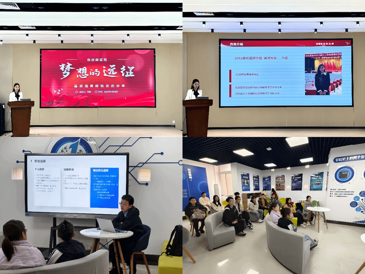 与此同时,“选择感恩,用奉献回馈家乡”,2020届甘肃选调生、外国语学院本科生马婧从“职业前景、备考经验、驻村分享”三个方面分享了她下沉基层的心路历程和现实问题;2020届湖北选调生、航海学院硕士研究生向宏坤强调选择“选调”,不只是一件工作,更是一种情怀,一份使命;2022届山西省选调生、计算机学院硕士研究生赵国靖就个人职业选择、备考经历和工作感悟鼓励师弟师妹们要在自己的可接受范围内选择一份有意义的工作;“行程万里,初心如一”,2023届新疆选调生、微电子学院本科生吾拉尔汗·吾木尔汗就“基层怎么样”“基层如何运转”等问题进行了概括与总结;2023届云南选调生、物理科学与技术学院硕士研究生周鑫围绕选调生报考政策、不同岗位的性质和流动、选调省份和地点的特点以及工作过程中面临的困难和成就感等话题展开了分享。