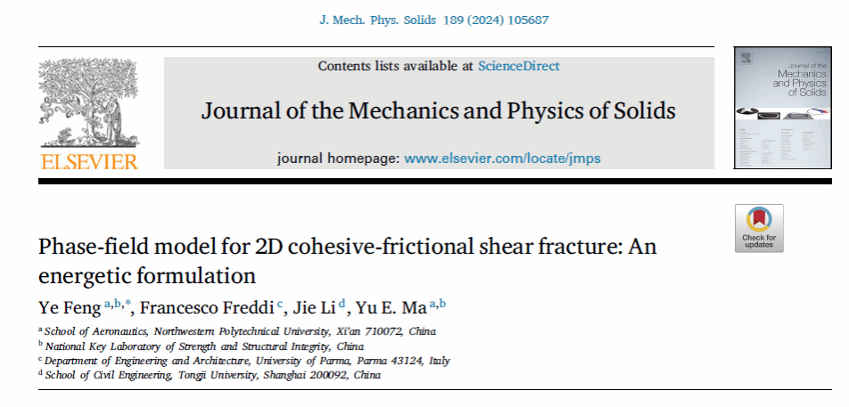 近期,beat365航空学院青年教师冯晔副教授在固体力学旗舰期刊Journal of the Mechanics and Physics of Solids (JMPS)上发表题为《Phase-field model for 2D cohesive-frictional shear fracture: An energetic formulation》的研究论文。