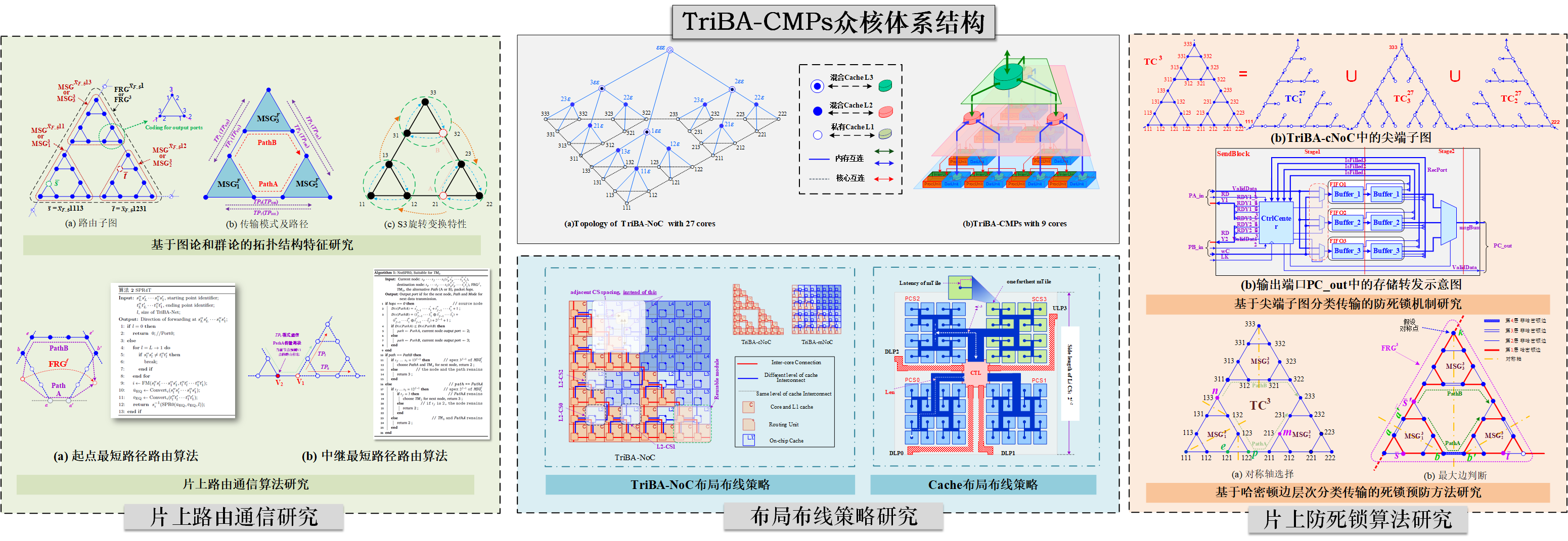 研究所石峰教授于2005年提出基三众核架构(Triplet-Based Many-core Architecture,TriBA),TriBA是一种新颖的从底层支持面向对象技术的多核并行体系架构,该架构由通信子网络TriBA-cNoC和内存子网络TriBA-mNoC组成,并采用了基于瓦片(Tile-based)的布局布线方法和模块化的设计理念。虽然其拓扑结构具有3D风格,但却能够将两种子网络集成在同一个硅平面上,在实现晶圆面积的最佳使用效率的同时能够实现相同单元模块的重用。该方向以基三众核架构为主要研究对象,以提高其性能和可用性为主要目标,对该架构的路由算法、布局布线策略、片上存储、防死锁策略等关键技术进行系统研究。