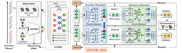 研究内容:在无服务器计算环境下,通过图神经网络、多智能体强化学习等技术,提出了面向跨域数据分析的细粒度函数编排技术,解决了广域环境下无服务器函数调度和资源管理中的关键难题。具体内容包括:基于分层图神经网络的作业状态表示;指针网络驱动的批量函数调度;基于多智能体强化学习的分布式函数编排;融合弹性并行度的函数拥塞控制。