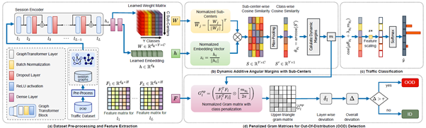 DynAAM-PG是一种用于加密网络流量分类的新型框架,专注于解决类别不平衡和分布外样本(OOD)检测问题。该框架采用基于 GraphTransformer 的编码器以提升特征表示能力、动态角度正则化提升少数类别的可分性,并使用带惩罚的Gram矩阵实现零样本OOD检测。基准评估显示其在分类精度和OOD检测方面优于现有方法,具备在实际环境中应用的潜力。