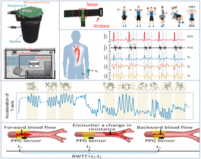 研究内容:利用各类感知设备监测人体生理健康。具体内容包括:利用智能音箱和腕带式PPG传感器进行健身动作检测;利用运动传感器重构心电信号;使用智能耳机监测肠鸣音并评估健康状态;基于腕带式PPG传感器、智能耳机以及毫米波设备进行人体血压监测等。