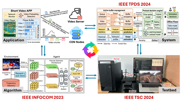 研究内容:通过将传统组合优化模型和数据驱动模型结合、在线推理和离线学习相结合,研究云边协同下的实时视频流传输与优化。具体内容包括:基于深度强化学习的视频流自适应比特率决策;基于多智能体元学习的360度全景视频传输优化;基于模仿学习的短视频流预加载控制;基于跨层协作的体积视频帧拥塞传控机制;以及多路径驱动下的低延迟视频流路径选择和调度等。