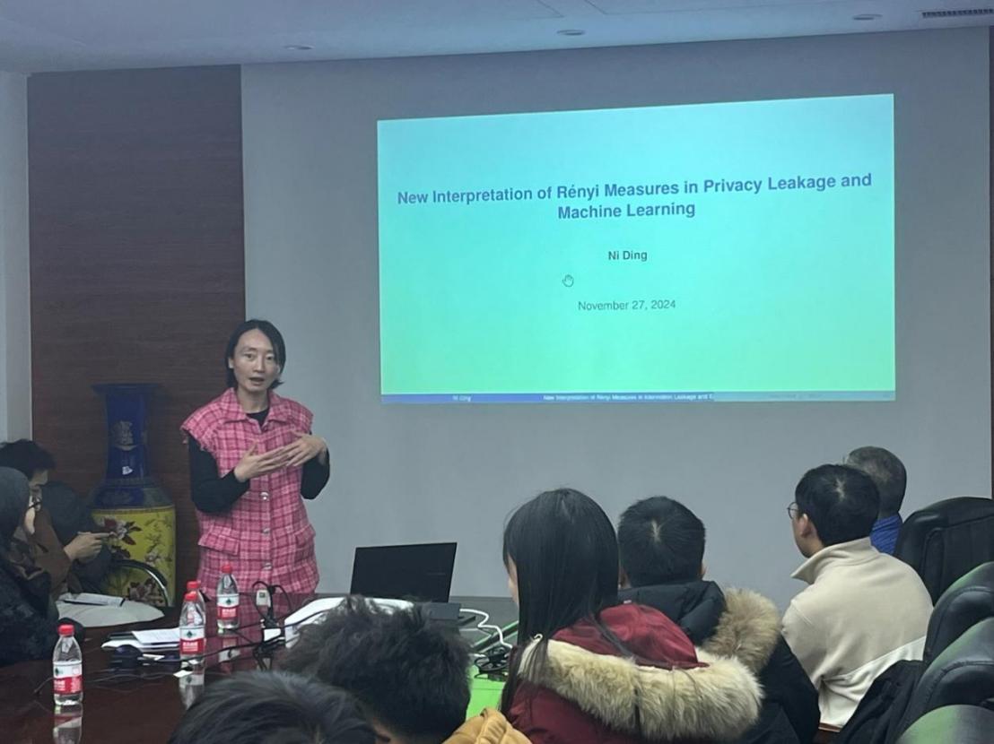 2024年11月27日,奥克兰大学丁妮博士应kaiyun开云官方网站邀请,在中心教学楼举分别作题为“隐私泄露与机器学习中的Rényi度量新解释”、“通过Kantorovich最优传输计划实现ε-Pufferfish隐私”的学术讲座,,讲座分别由kaiyun开云官方网站礼欣老师、胡晶晶老师主持,语言智能与社会计算研究所和网络攻防对抗研究所相关专业方向师生参加了讲座。