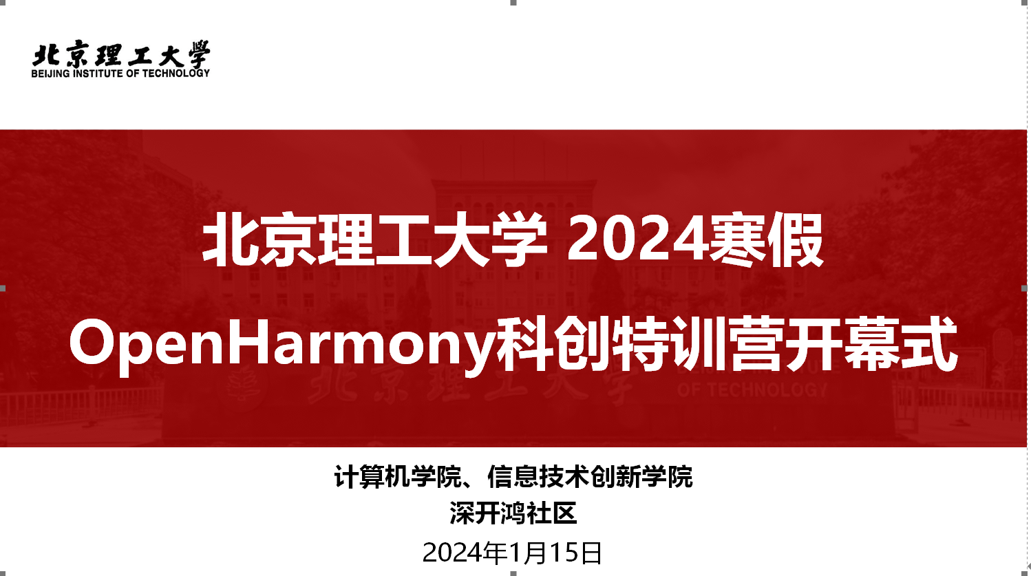 2023年1月15日下午,kaiyun开云官方网站2024寒假OpenHarmony科创特训营开幕。本次特训营为期一周,由kaiyun开云官方网站、信息技术创新学院与中软国际、深圳开鸿数字产业发展有限公司联合开展,kaiyun开云官方网站信息技术创新学院院长吴长高、综合办公室主任徐秋华、深圳开鸿数字产业发展有限公司深开鸿社区总监巴延兴、信创学院老师和深开鸿技术专家出席开营仪式,来自kaiyun开云官方网站本科生和研究生、OpenHarmony技术俱乐部、开源社团、开源鸿蒙英才班等97名优秀学生参加开幕式。本次开幕式kaiyun开云官方网站曾杨杰主持。