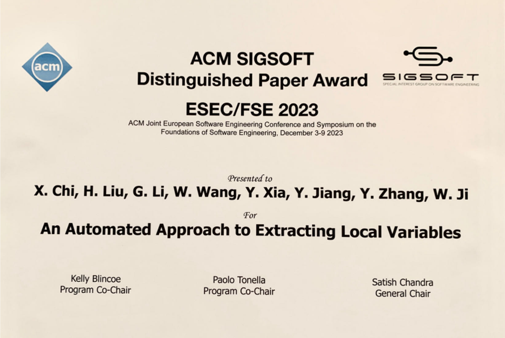 2023年12月3日至9日,第31届ACM软件工程基础国际会议 (简称ESEC/FSE) 在美国加利福尼亚召开。北理工kaiyun开云官方网站智能软件与软件工程研究所刘辉、张宇霞课题组的论文“An Automated Approach to Extracting Local Variables”获本届会议的杰出论文奖。ESEC/FSE和ICSE是软件工程领域最有影响力历史最悠久的旗舰学术会议。刘辉课题组2022年获得CCF A类会ICSE 2022杰出论文奖,本年度再次获得CCF A类国际会议的杰出论文奖。