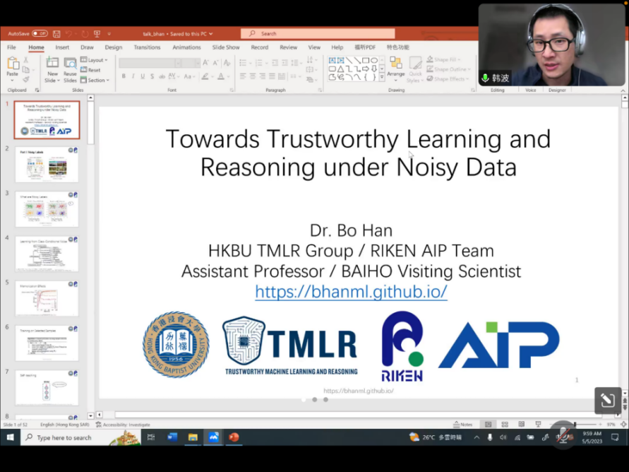 韩波老师的介绍了存在噪声数据的情况下,如何实现可信赖学习与推断。报告从噪声标签、噪声特征、噪声交互、噪声数据四个方面出发,介绍了近年来韩老师团队的相关研究成果,包括:基于神经网络记忆效应的Co-teaching+、为决策边界数据赋予高权值的GAIRAT等多种模型。