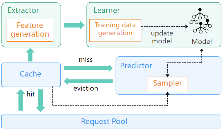 获奖论文题目为《LBSC: A Cost-aware Caching Framework for Cloud Databases》。现有云数据库通常采用存储-计算分离(storage-aggregation)架构,通过在计算节点设置缓存来降低查询延迟。然而,这些缓存算法并不适用于云数据库,主要因为它们无法适应动态变化的工作负载,并且未考虑数据获取的时间成本。现有研究提出了基于机器学习的方法来适应动态负载变化,将学习模型与成本感知的缓存算法结合来解决该问题。然而,在这种场景下,Belady算法并非最优,无法有效指导学习模型,且使用学习模型会引入显著的计算开销,甚至可能恶化云数据库的性能。针对上述问题,课题组提出了一个基于学习、成本感知的高性能缓存框架LBSC。该框架提出了一种近似最优的算法BeladySizeCost,将高获取成本且可能在不久将被访问的数据项保留在缓存中。同时,设计了一个轻量级学习模型来模拟BeladySizeCost的行为,以预测待驱逐的缓存数据。LBSC还设计了多种优化措施,以减少学习模型的计算开销,从而提升整体性能。